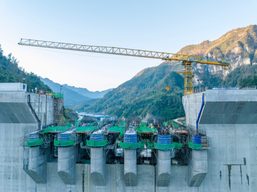11月28日,吉首市矮寨镇大兴寨水库工程建设现场,工人正在进行8#9#溢流坝段施工。初冬时节,工程建设单位科学调度施工力量,利用晴好天气和枯水期窗口,确保该重点水利工程按计划高效推进。彭璟 摄(湖南图片库)