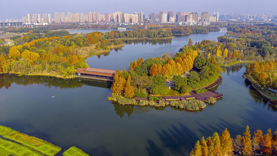 12月1日,长沙洋湖国家湿地公园,梧桐、银杏、水杉、湖水等色彩斑斓,风景如画。湖南日报全媒体记者 童臻熙 摄