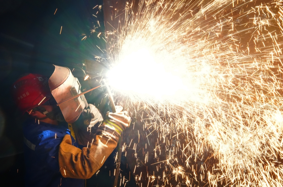 3月16日,衡山经济开发区,湖南恒岳重钢钢结构工程有限公司员工在加工风电塔筒部件。春节后该公司生产订单充足,呈现供需两旺的良好生产态势。曹正平 阳剑清 摄影报道(湖南图片库)