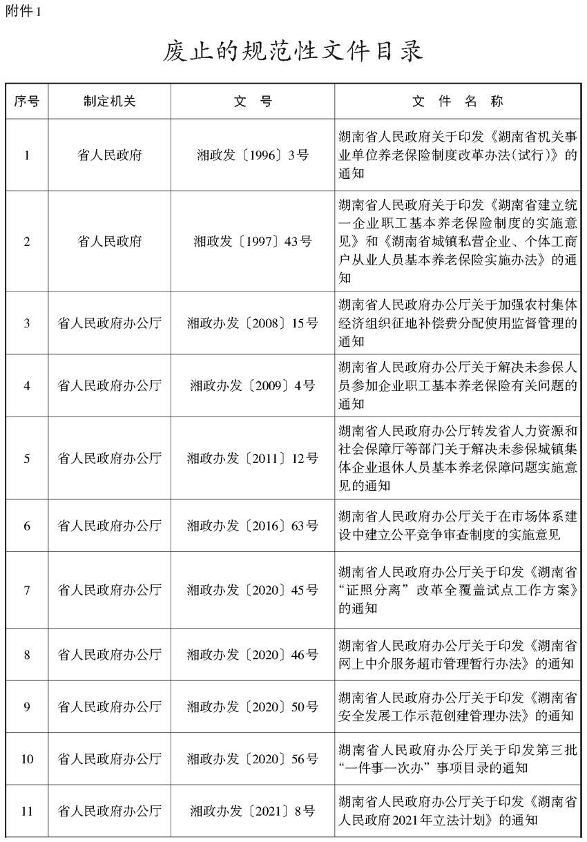 一、废止《湖南省人民政府关于印发〈湖南省机关事业单位养老保险制度改革办法(试行)〉的通知》(湘政发〔1996〕3号)等23件规范性文件。