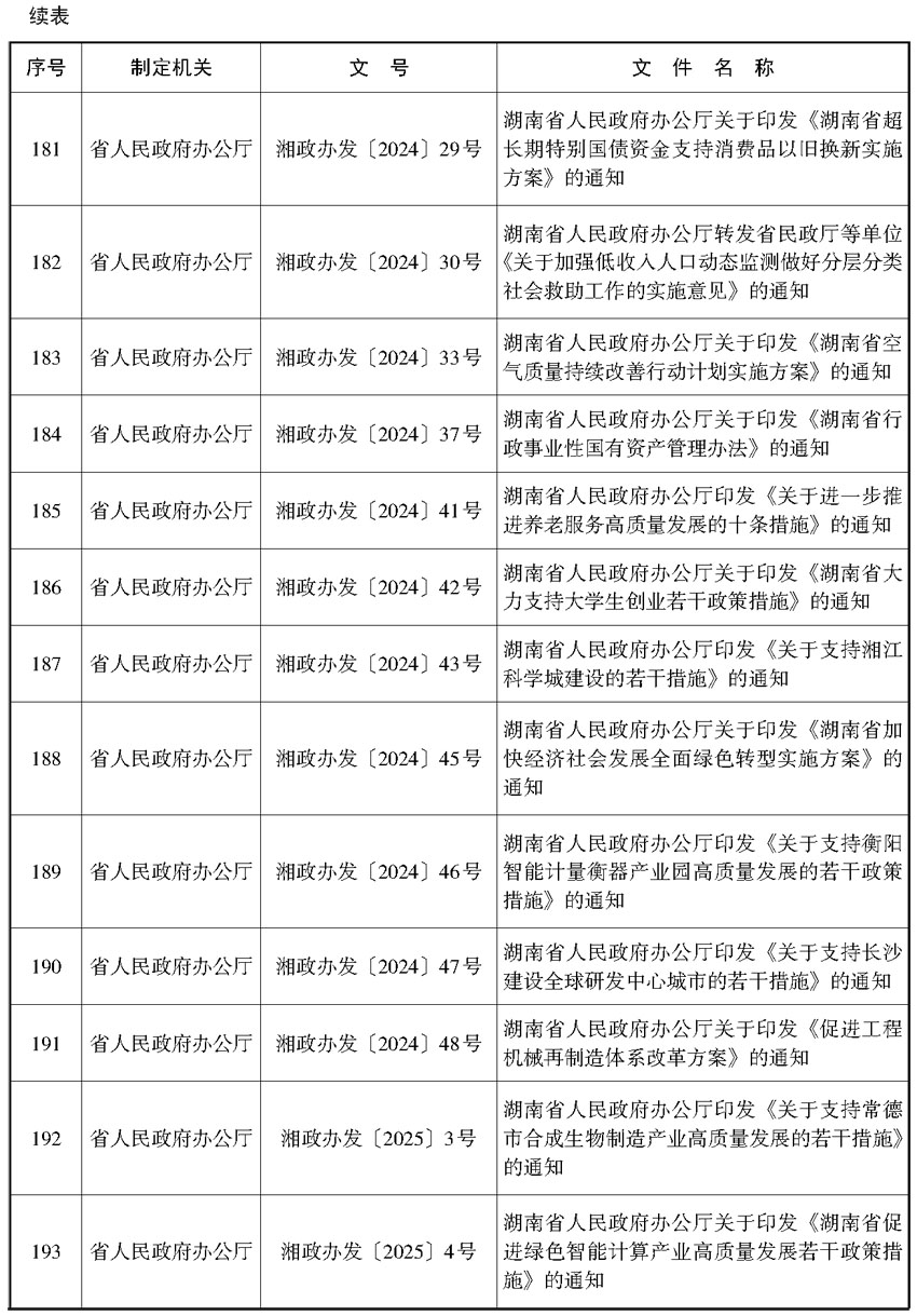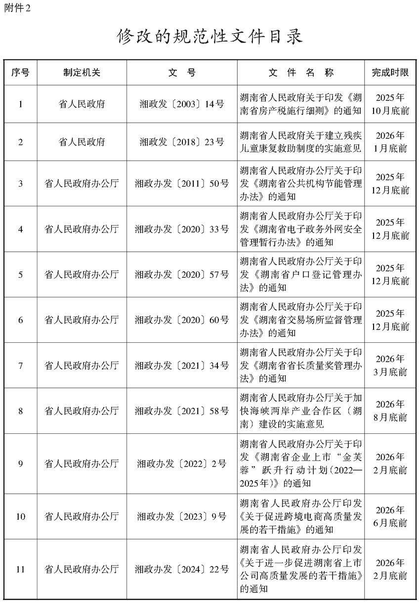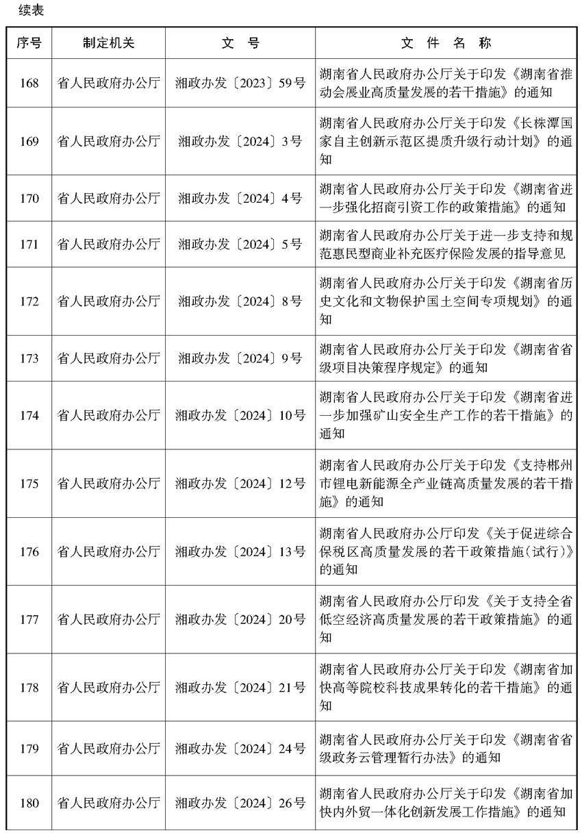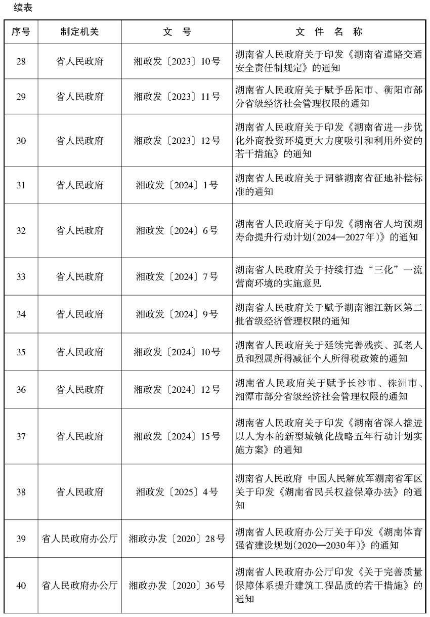 为加快建设法治政府,维护省政府行政规范性文件的权威性和严肃性,根据《湖南省行政程序规定》和《湖南省规范性文件管理办法》等规定,省政府对2025年2月28日前以省政府和省政府办公厅名义制发的现行有效的规范性文件进行了全面清理。现决定将清理结果公布如下: