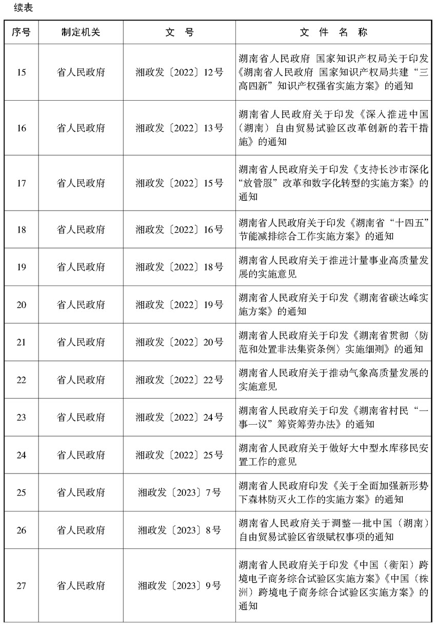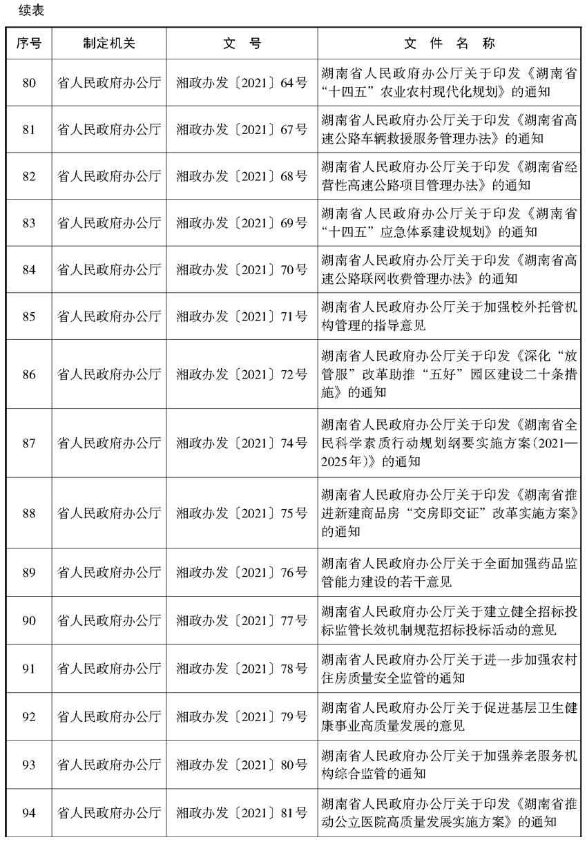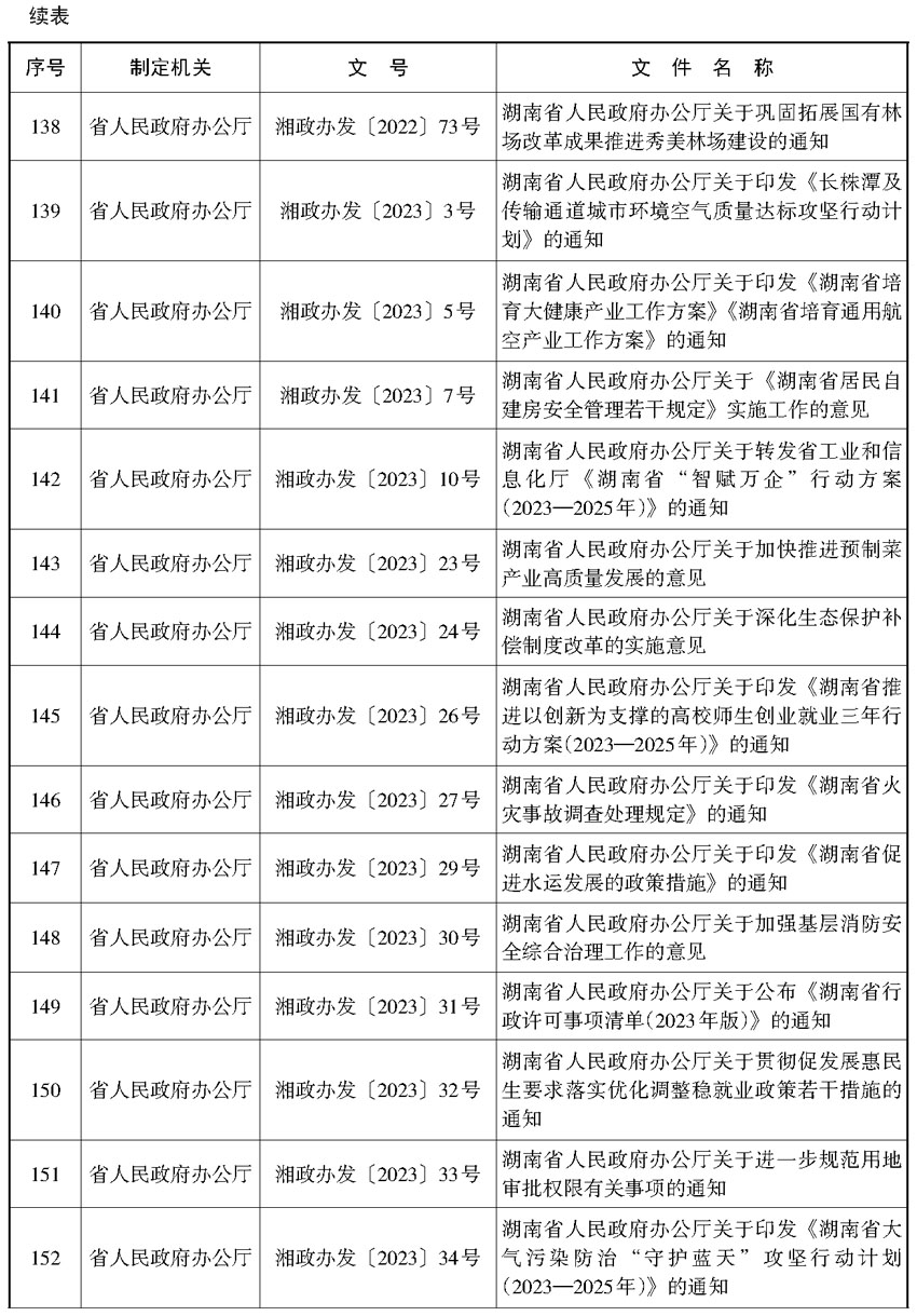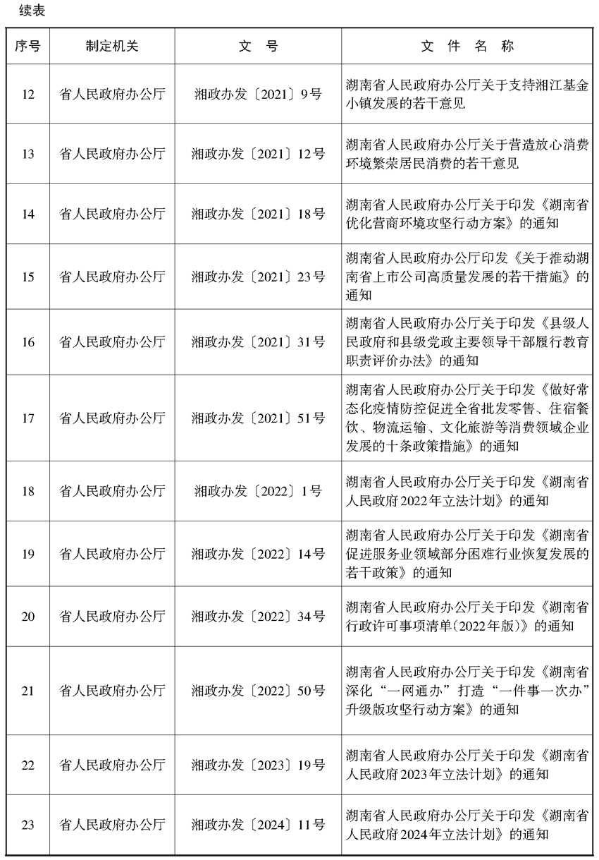 为加快建设法治政府,维护省政府行政规范性文件的权威性和严肃性,根据《湖南省行政程序规定》和《湖南省规范性文件管理办法》等规定,省政府对2025年2月28日前以省政府和省政府办公厅名义制发的现行有效的规范性文件进行了全面清理。现决定将清理结果公布如下: