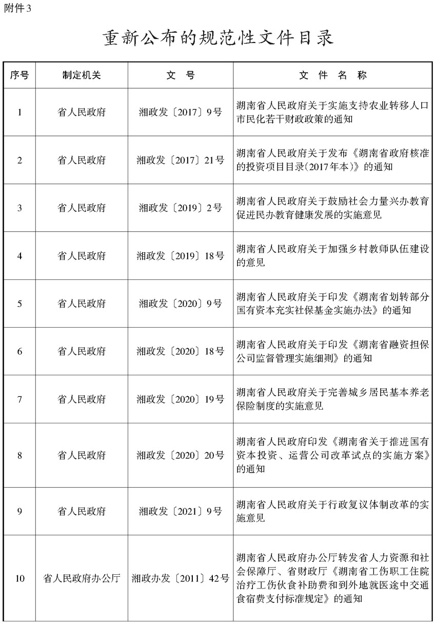 三、重新公布《湖南省人民政府关于实施支持农业转移人口市民化若干财政政策的通知》(湘政发〔2017〕9号)等19件规范性文件。