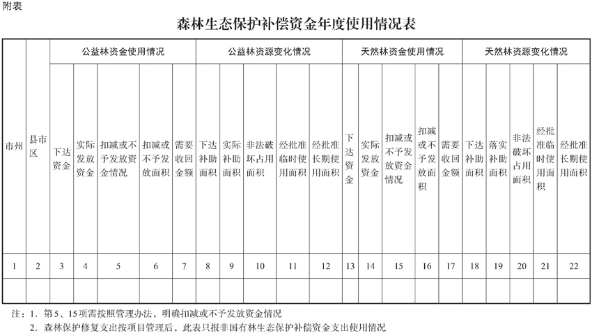 第十五条 各地应于每年11月底前报送森林生态保护补偿资金年度总结,内容应包括但不限于资金拨付使用情况(含扣减或不予发放资金的情况)、公益林和天然商品林资源变化情况(含当年实际补助面积,非法破坏或占用、经批准临时使用、经批准长期使用的森林资源情况)、专项资金预算绩效管理和监督工作情况,并附2000坐标系、shp或gdb格式的矢量数据,由市州财政、林业主管部门审核汇总所属县市区情况后报送至省财政厅、省林业局(详见附表)。