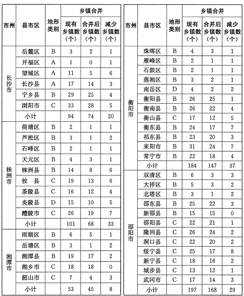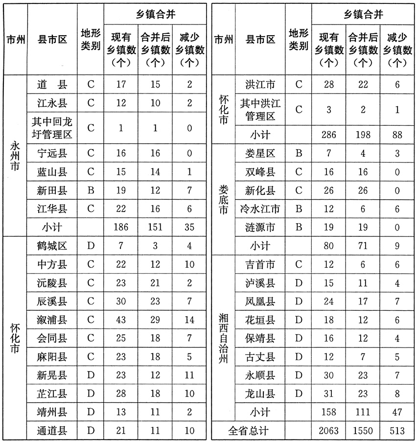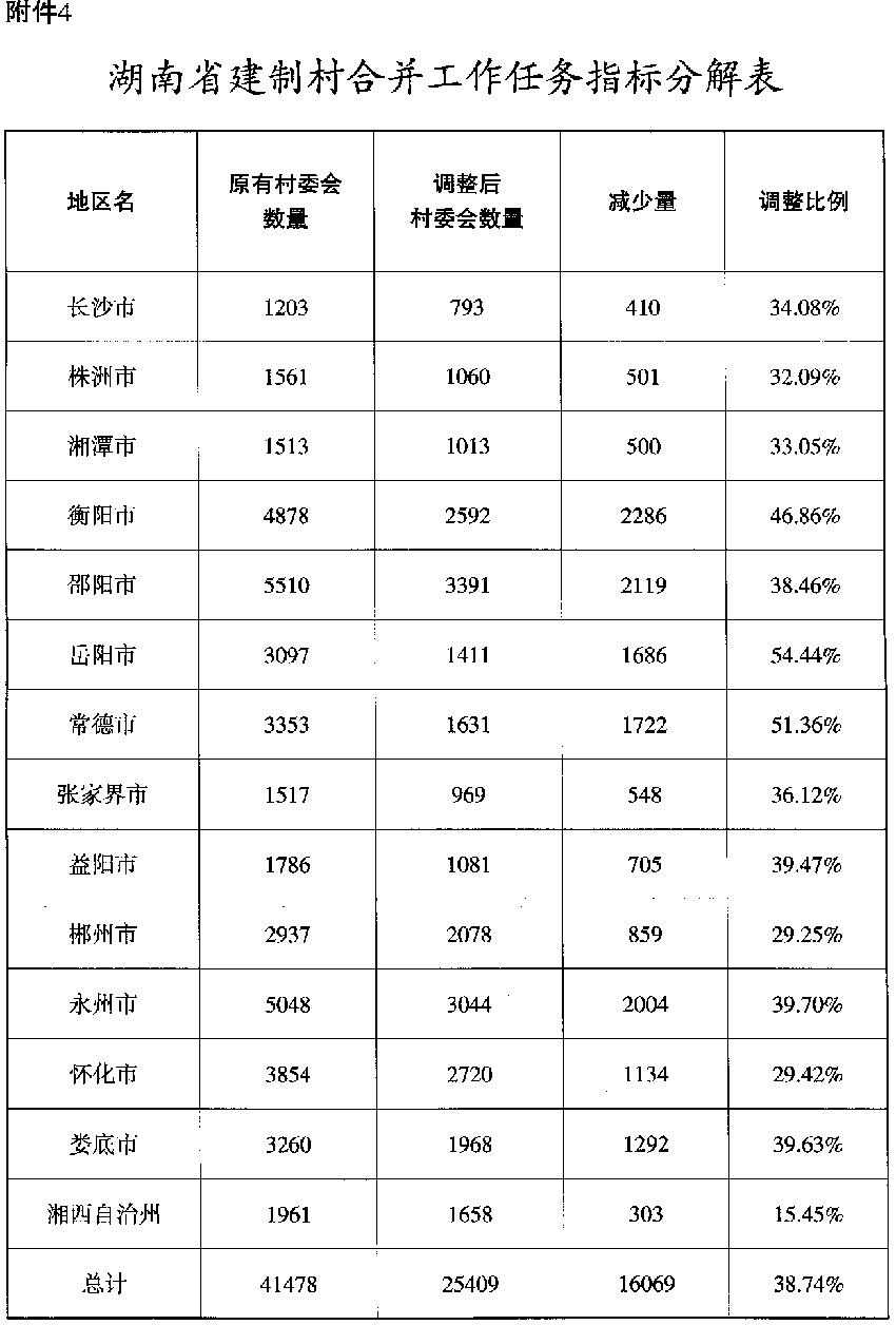 (一)目标任务。此次乡镇区划调整改革工作,按照优化结构、合理布局、规模适度、有利发展的要求,合理确定乡镇和村的规模。全省目标任务为合并乡镇500个以上,减幅约25%;合并建制村16000个以上,减幅约39%。合并乡镇目标任务省直接测算到县市区,合并建制村目标任务省测算到市州,再由市州测算到县市区。