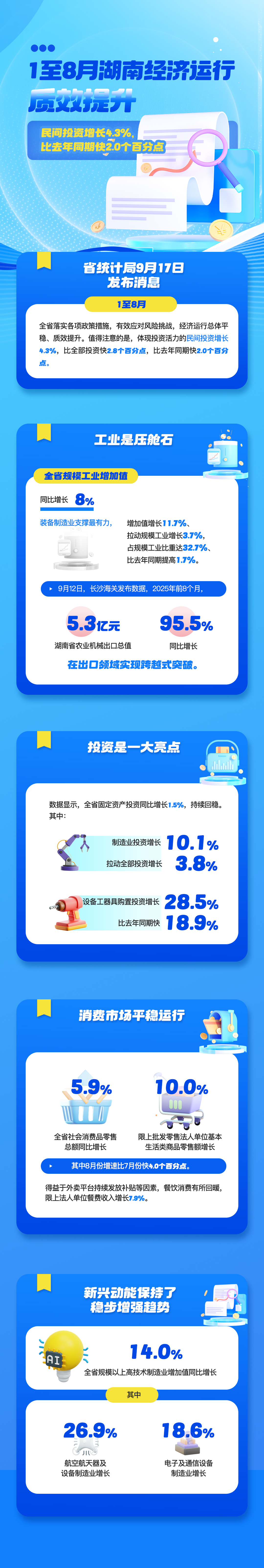 1至8月湖南经济运行质效提升民间投资增长4.3%,比去年同期快2.0个百分点