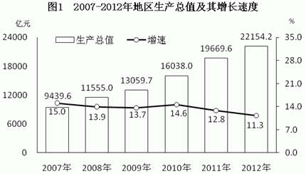 初步核算,全省地区生产总值22154.2亿元,比上年增长11.3%。其中,第一产业增加值3004.2亿元,增长3%;第二产业增加值10506.4亿元,增长12.8%;第三产业增加值8643.6亿元,增长12.2%。按常住人口计算,人均地区生产总值33480元,增长10.7%。