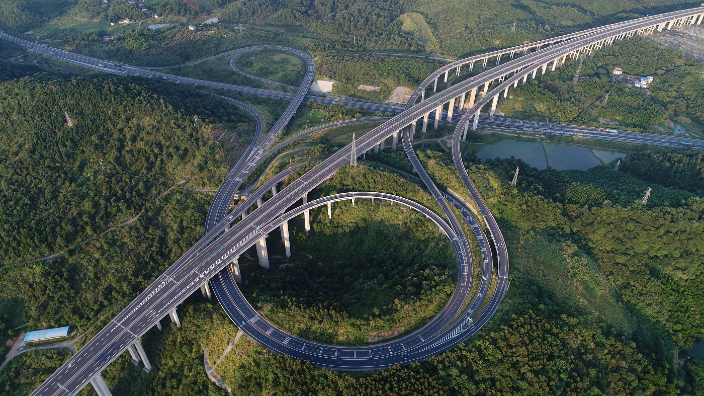 水龙互通立交桥为郴宁高速的控制性工程,共有5处跨京港澳高速公路,其桥面距京港澳高速公路路面最大高差为50.34米,是亚洲高速公路桥面高差最大的互通立交桥,也是郴宁高速全线安全风险最大、曲线半径最小、施工最难的互通立交。