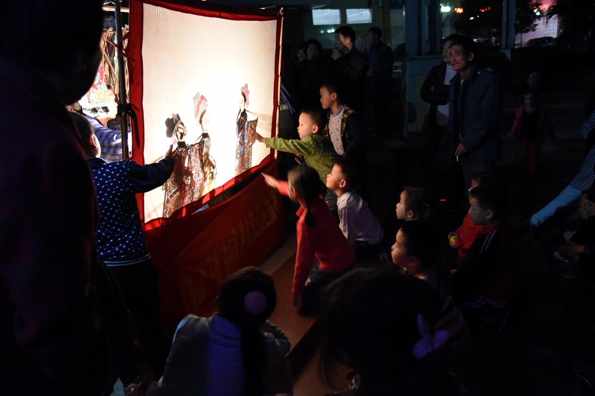 影子戏又称皮影戏,灯影戏,荟萃了剪纸、绘画、雕刻、地方戏、口技等艺术精华,被誉为中国传统文化的“活化石”,也是目前衡阳市唯一被列入《人类非物质文化遗产代表作名录》非物质文化遗产,为衡山广大群众喜闻乐见。此图于夜色深深时刻拍摄衡山民间艺人演出《谁是大英雄》,一群老少围拢在一起,民间艺人以唱故事这种“贯输式”艺术方式,让人们特别是小朋友于潜移默化的感染中受到熏陶教育和启迪,在影子戏渐行渐远而电影、电视、电脑普及时代,衡山影子戏却能够生命焕发,延绵不绝,表明越是民族的、越是古老的,就越有特色,越属于世界。