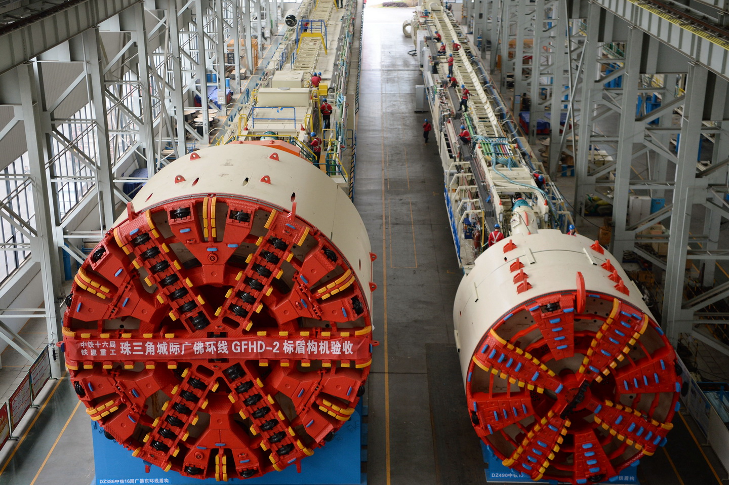 铁建重工长沙第一产业园总装车间,工人正在装配盾构机。