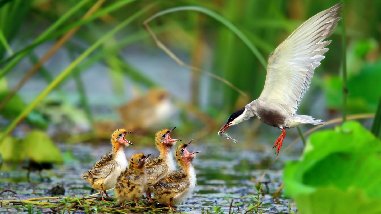 湘阴鹤龙湖,须浮鸥哺育幼鸟。