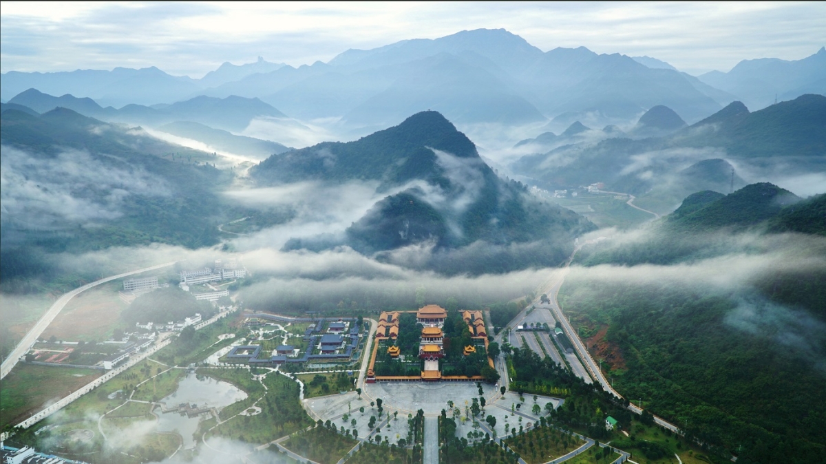 九嶷山巅的云雨是《舜陵潇湘夜雨》中“永州阴岭秀,舜庙九嶷苍;浩荡千山峻,妖娆万水长”的美妙诗句,舜帝陵上的烟云是《七律˙答友人》里“九嶷山上白云飞,帝子乘风下翠微”的动人诗篇。舜陵烟雨,是一场从天而降、绵延千年的甘霖,洗去九嶷圣山的百代铅尘,托出舜德文明的万道霞光。图为烟雨洗礼之下的九嶷山舜帝陵及碑林。
