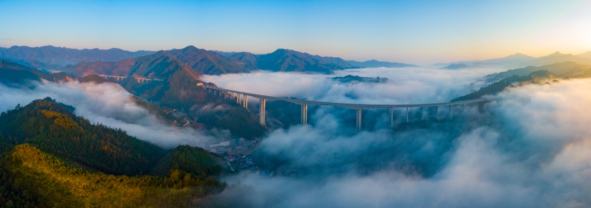 2017年11月27日清晨,娄怀(娄底至怀化)高速溆浦县三江镇三江特大桥,青山如黛、云蒸霞蔚如仙境,大桥仿佛天路入云端,美不胜收。