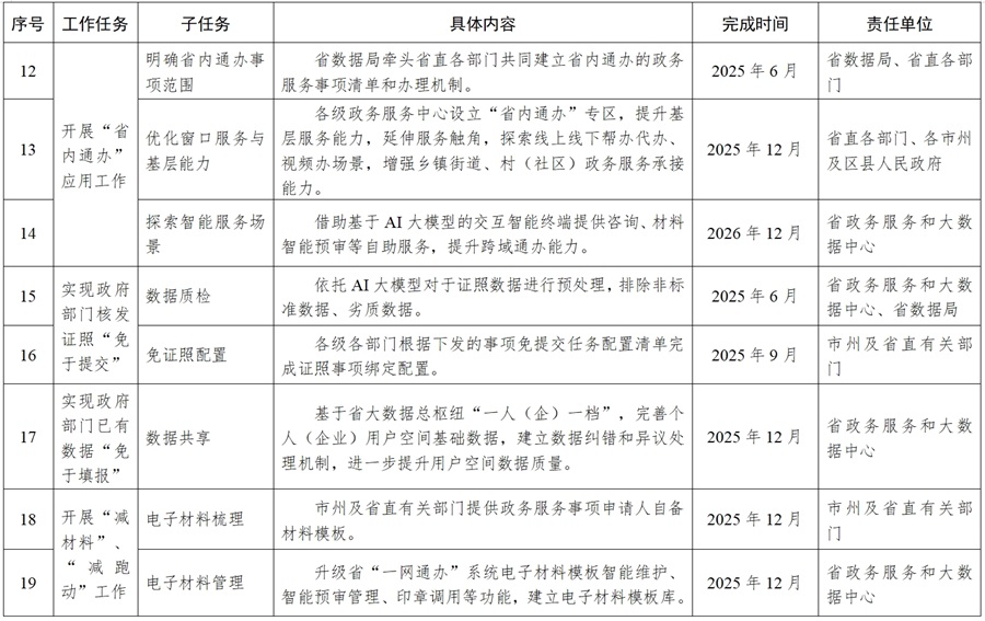 4.开展“省内通办”应用工作。省数据局牵头建立省内通办的政务服务事项清单和省内通办机制,各级政务服务中心设立“省内通办”专区,创新线上帮代办、线下视频办服务场景,借助基于AI大模型的交互智能终端提供咨询、材料智能预审等自助服务,提升跨域通办能力,2026年12月底前基本实现省内通办。