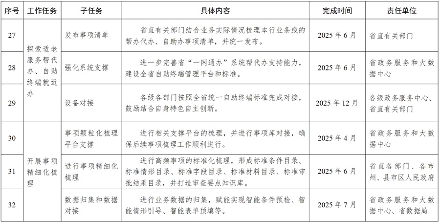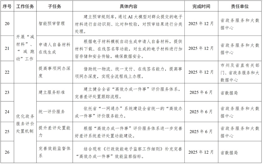 2025年底前,按照“应对接尽对接”原则,实现全省依申请类政务服务事项与省“一网通办”系统的对接率和上线率均达到100%,政务中心设备与省“一网通办”系统全面对接;基于AI大模型对省政务服务网进行智能化改版升级;推进电子证照“免提交”、表单信息“免填写”、电子签名“减材料”、物流支付“减跑动”等工作,促进数字政务建设取得明显成效。