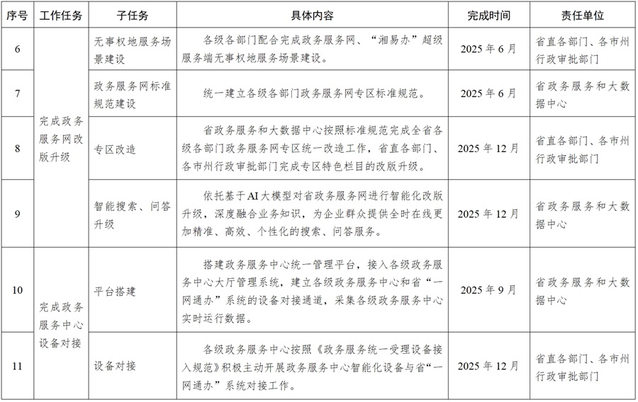 2.完成政务服务网改版升级。各级各部门梳理政务服务网线上服务情形问答、事权划分标准等,完成相关配置,并配合完成政务服务网、“湘易办”超级服务端无事权地服务场景建设。各级各部门按标准完成专区改版升级。基于AI大模型对省政务服务网进行智能化改版升级,深度融合业务知识,为企业群众提供全时在线更加精准、高效、个性化的问答、搜索服务。